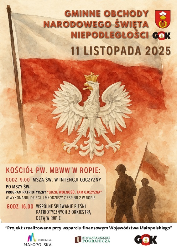 Drukuj Powrót do poprzedniej strony Zaproszenie na obchody Święta Niepodległości 06.11.2025 12:07 Treść Projekt zrealizowano przy wsparciu finansowym Województwa Małopolskiego